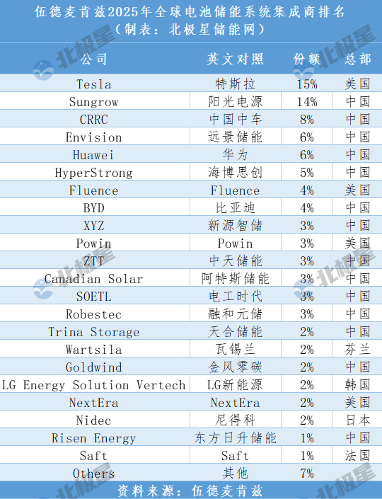 2025年8月1日,伍德麦肯兹Wood Mackenzie发布《2025年全球储能系统集成商排名报告》,共有来自全球7个国家22个储能集成商上榜,占全球94%市场份额。其中14家中国企业上榜,占全球储能系统市场份额63%。中企成为化学储能的中坚力量。